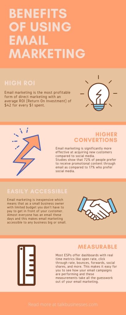 Almost everyone has an email these days and this makes email marketing accessible to any business big or small. Email marketing is inexpensive which means that as a small business owner with limited budget you don’t have to pay to get in front of your customer. Though you may need to use an email marketing provider (ESP), to send and manage your email lists, many ESPs have free accounts, so you don’t need to invest a lot of money up front. This makes email marketing scalable and easy to get started.